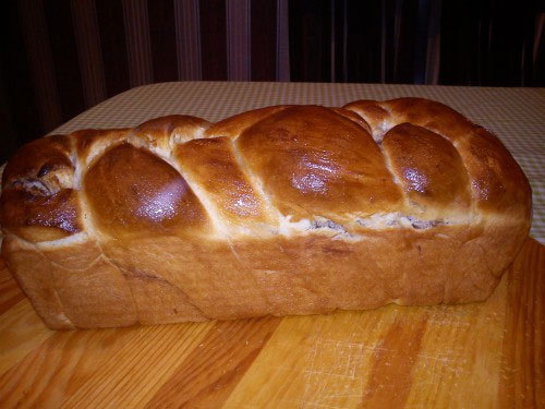 A tésztát kilisztezett nyújtódeszkára borítjuk, három egyenlő részre osztjuk. Mindhárom darabot megsodorjuk, ha mazsolát szeretnék bele tenni, most megtehetjük. Ha kakaóval szeretjük, egy kicsit kinyújtjuk a darabokat, majd olvasztott margarinnal megkenjük és megszórjuk kakaóval. Ezután összesodorjuk és megfonjuk a kalácsot. Margarinnal kikent magas falú tepsibe tesszük (legjobb a 75 dkg-os kenyérforma) és újra megkelesztjük.