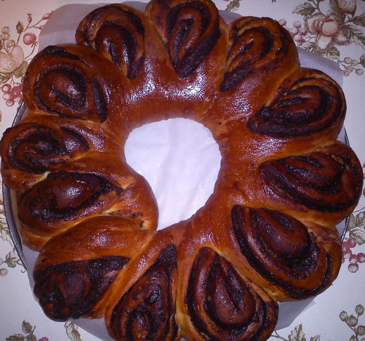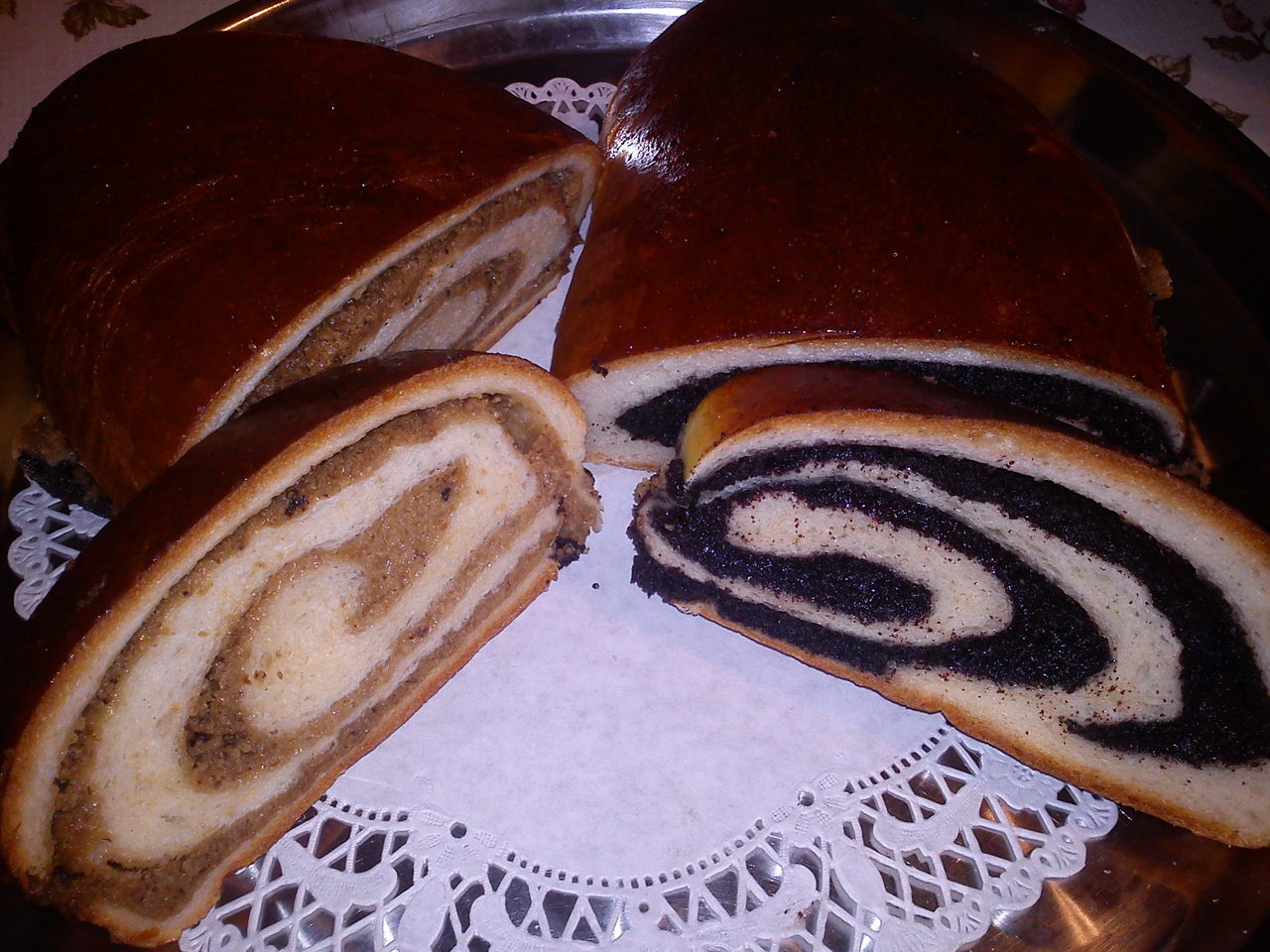 A hozzávalókból kemény galuskatészta állagú tésztát dagasztunk. Fényesre, pufogósra dagasztjuk, gyúrjuk, kétszeresére kelesztjük. 3 egyenlő részre osztjuk, ujjnyi vastagságú téglalapot nyújtunk belőle. Ujjnyi vastagon megkenjük a töltelékkel, feltekerjük, sütőpapírral bélelt tepsibe rakjuk, felvert tojásfehérjével megkenjük, 180 fokos sütőben megsütjük. A sütőből kivéve vízzel elkevert kristálycukorral kenjük meg. A jobb oldali képen látható koszorú a karácsonyi asztal dísze lehet, és csak egy kis trükk kell hozzá. A kalácsot egy kicsit hosszúkásabbra tekerjük fel, és kört formázunk belőle a tepsiben. Kb. 2 cm-enként bevágjuk, és a szeleteket kissé kifordítjuk, így sütjük meg.